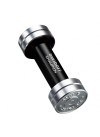 El frasco es una pesa de cristal negro con extremos plateados